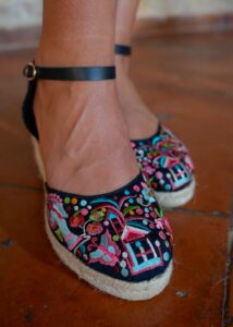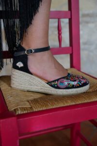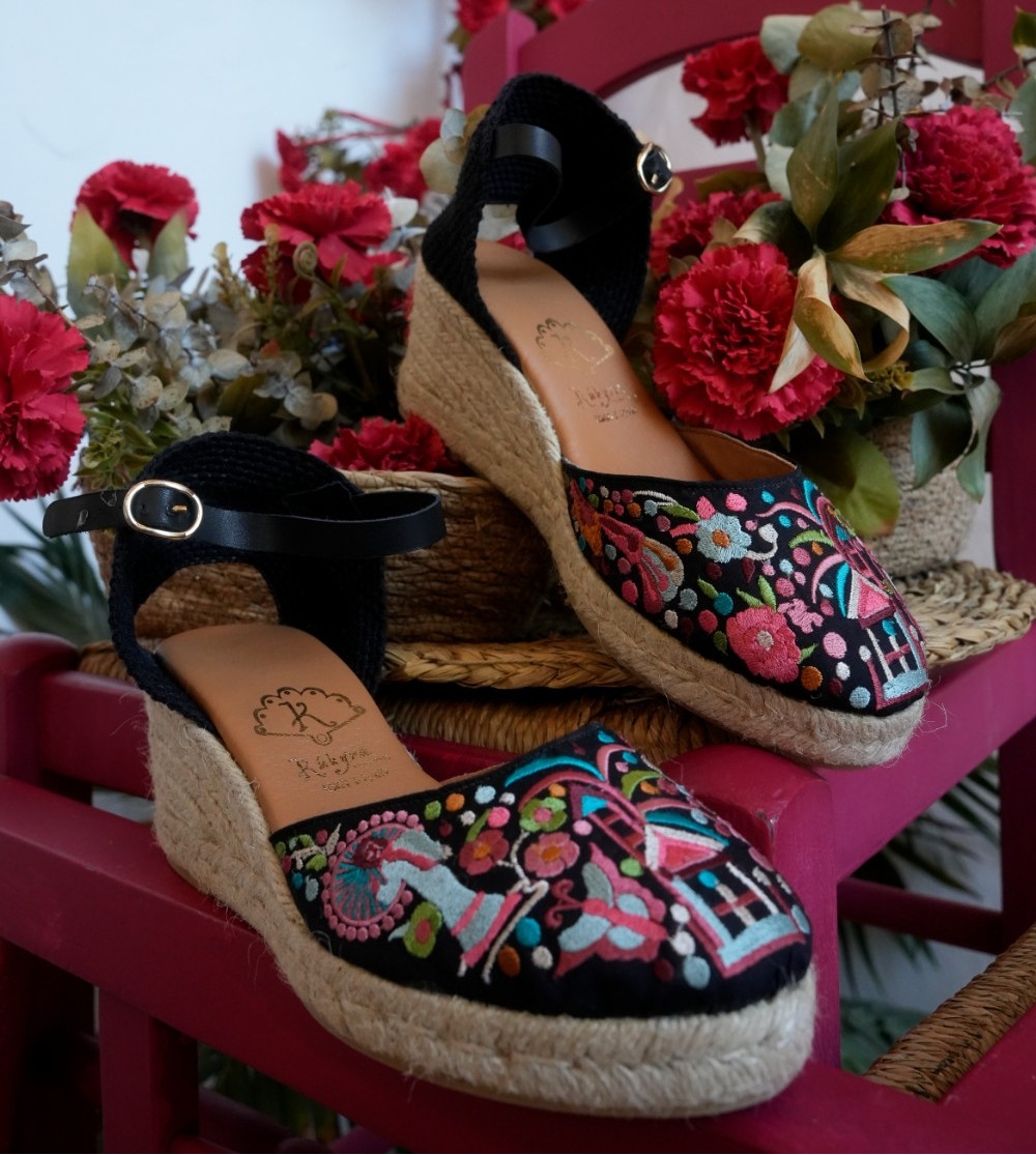Alpargata esparteña Loto negro bordada mantón antiguo con motivos chinos