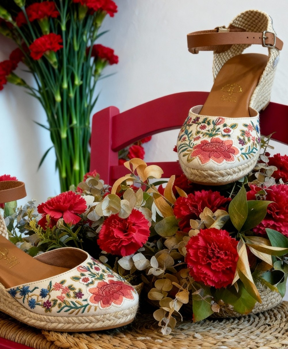 La alpargata esparteña Valle en color beige de Káhyra destaca por su diseño elegante inspirado en los tradicionales bordados de mantón. Su delicado bordado floral aporta un toque artesanal y femenino que realza el estilo clásico de este calzado.