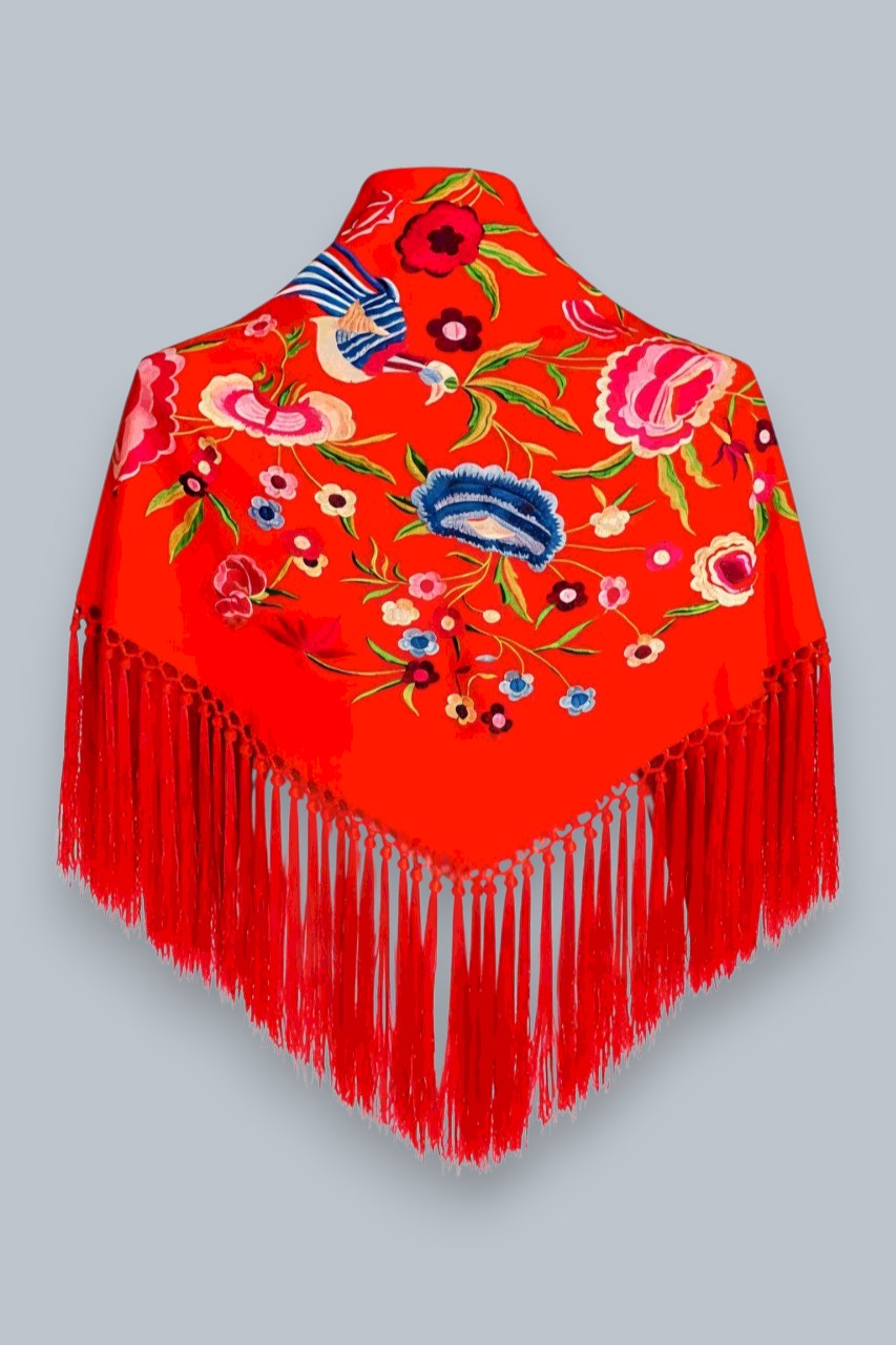 Mantoncillo rojo amapola con bordados fucsia, verde oliva, azul empolvado, marfil y burdeos